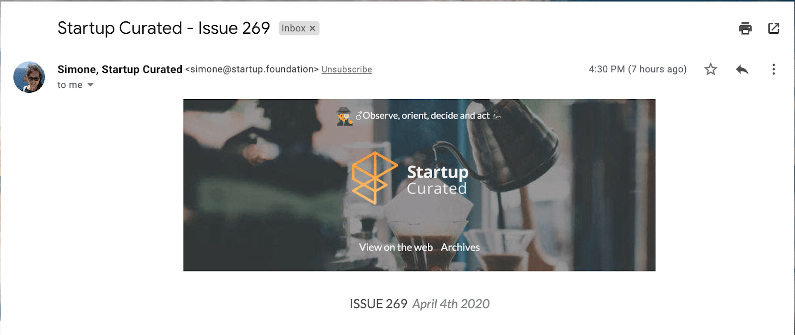 For example, Simone from Startup Curated just shares the issue number in their subject line such as Startup Curated – Issue 269.